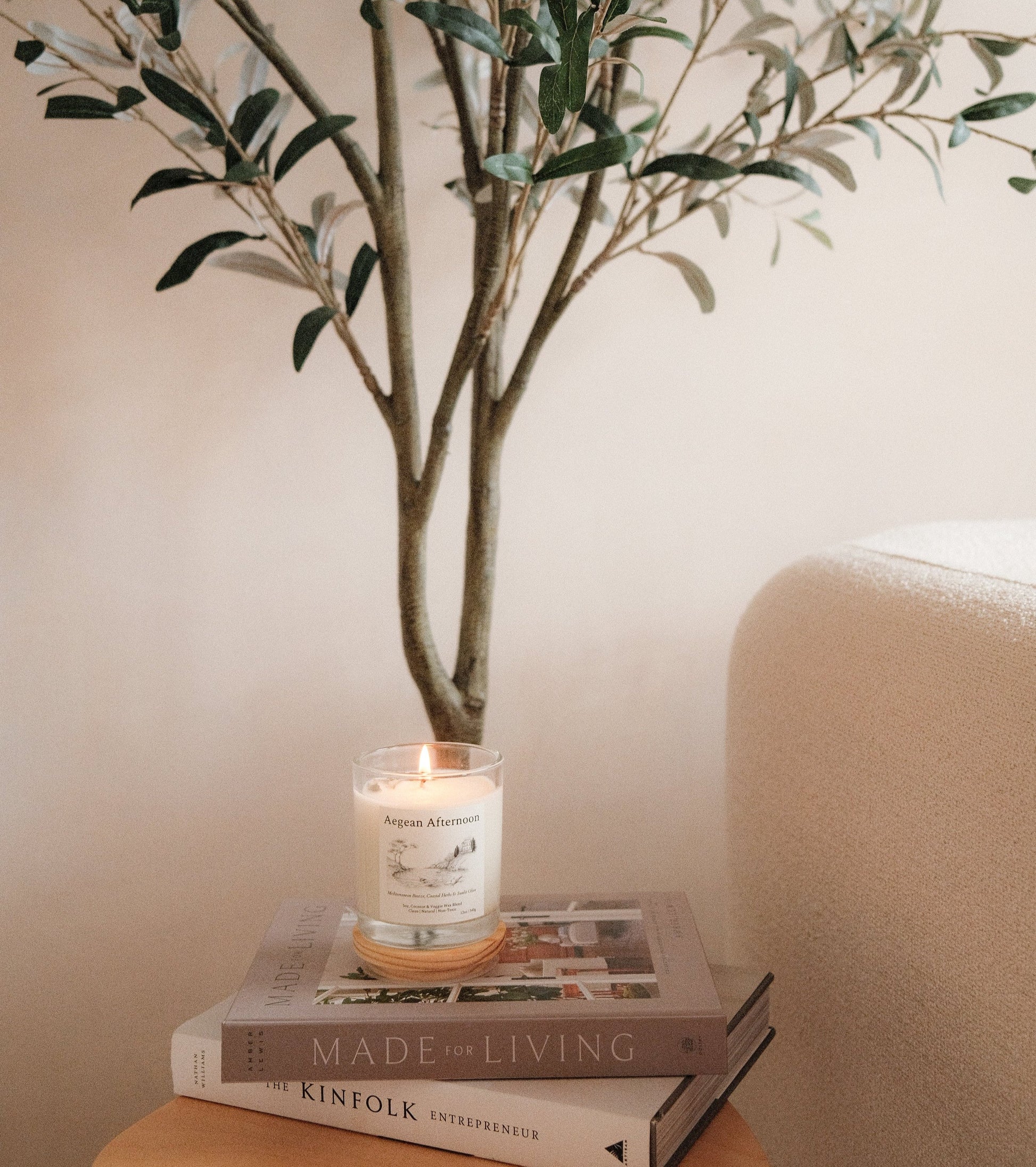 Mediterranean Breeze captures a refreshing blend of Olive Leaf and Citrus, while Coastal Herbs infuse a hint of earthy Rosemary. Sunlit Olive and Fig round out the aroma with a warm and grounding touch, reminiscent of a serene Aegean landscape.