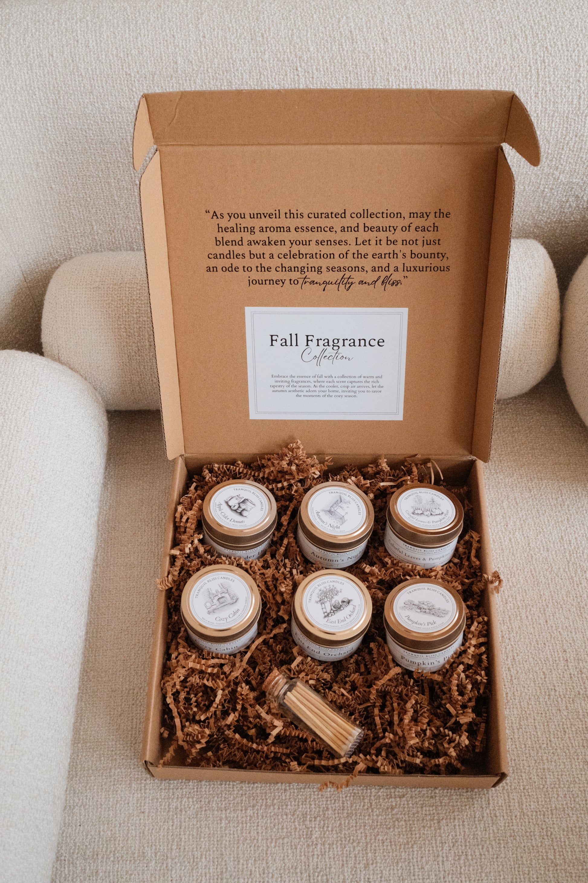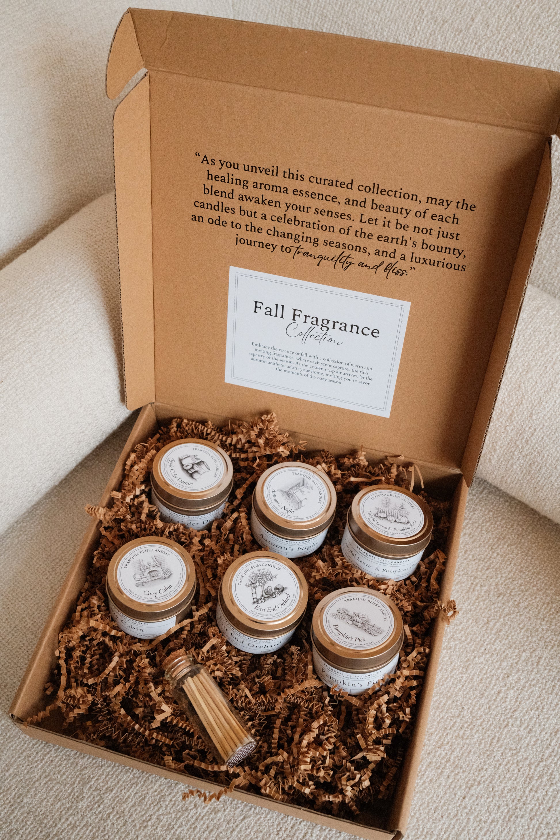 Introducing our much-anticipated Fall Fragrance Collection Gift Set, thoughtfully curated for the upcoming season and perfect for candle lovers. This beautifully crafted sampler box includes six generous 6oz tins, each filled with our top-selling fall scents: