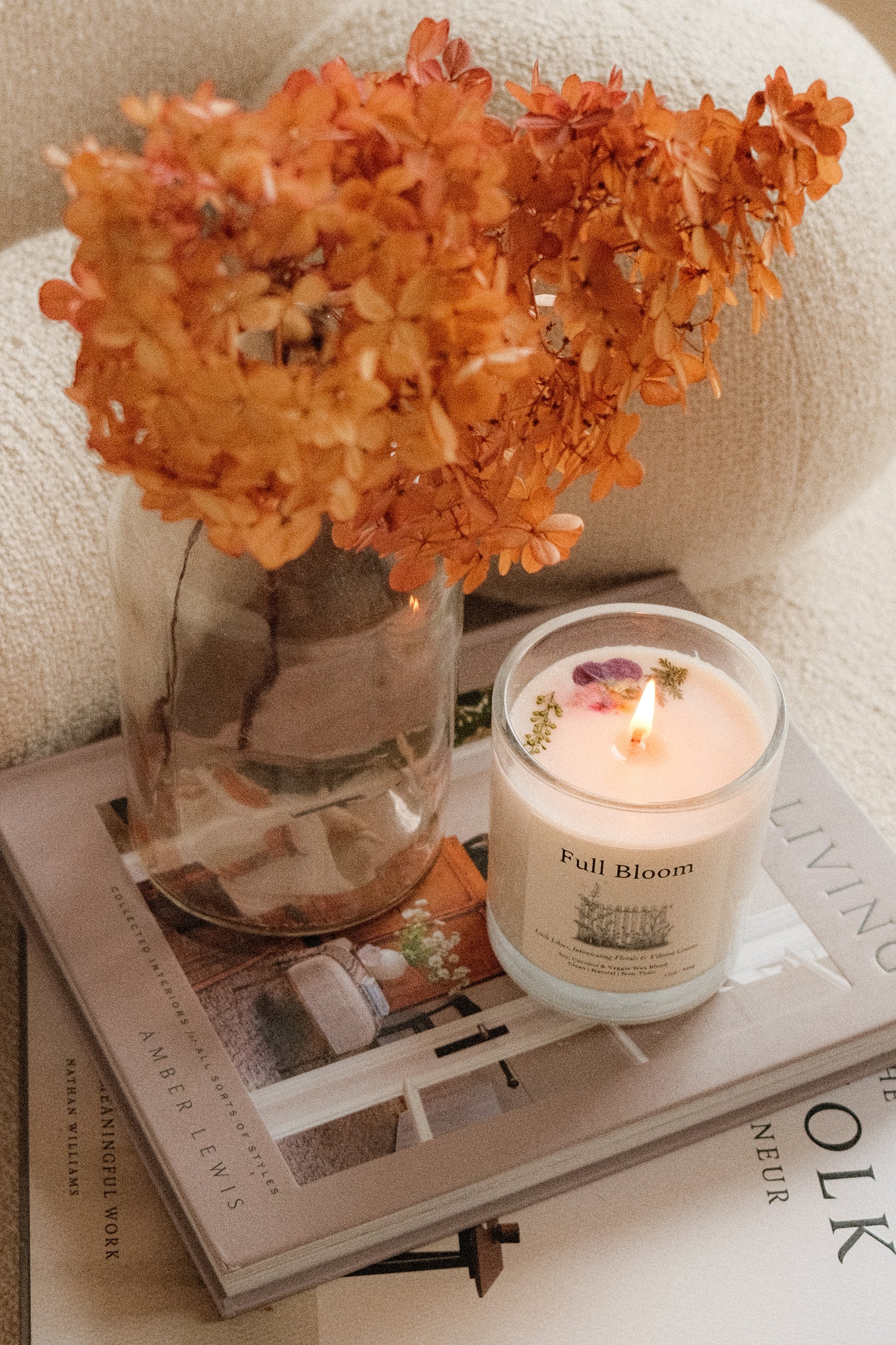 Embrace the vibrant essence of a blossoming garden with our Full Bloom candle. This luxurious blend captures the intoxicating scents of lush florals, combining the romantic notes of rose, jasmine, and lilac with the sweet undertones of freesia and hibiscus. Enhanced with a touch of fresh greenery and a hint of musk, this fragrance transports you to a sun-drenched garden in full bloom.