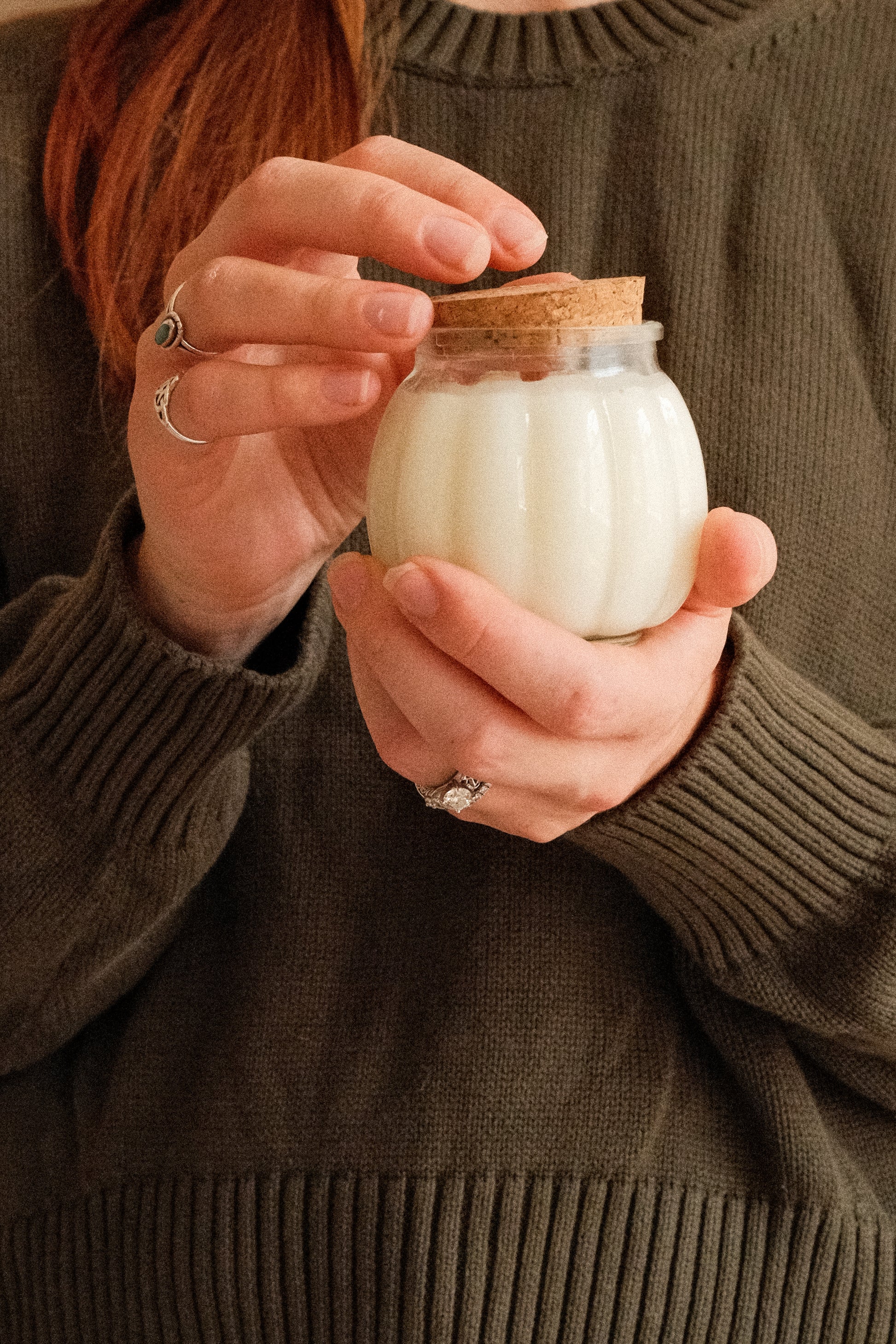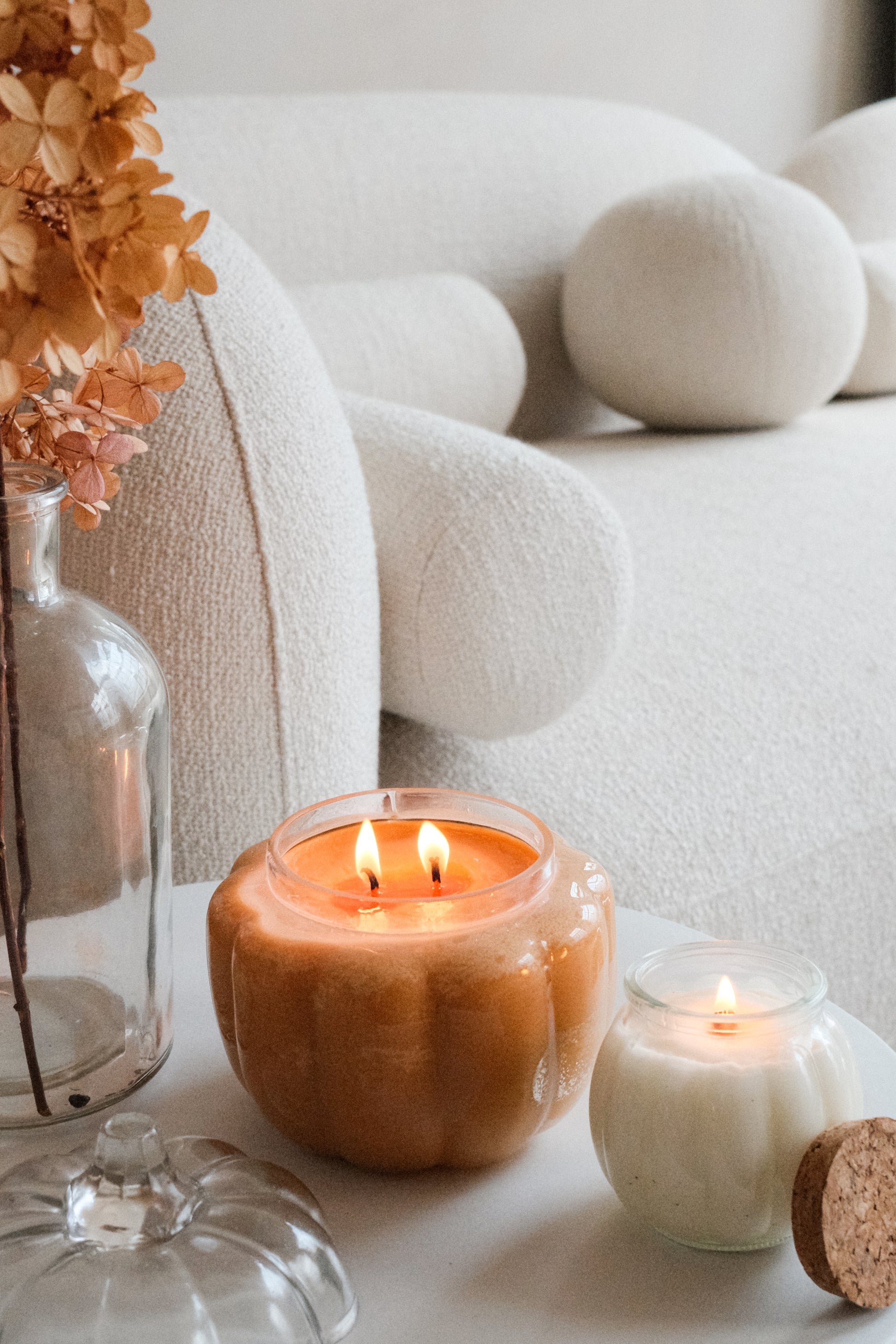Celebrate the autumn season with our charming pumpkin-shaped candles, available in two sizes: 7oz with a cork lid and 25oz with a glass stem lid